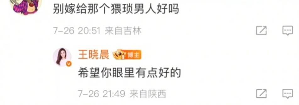 尽管如此,在她庆生的照片下仍有一些不和谐的声音,某位网友讽刺说:“别嫁给那个猥琐男人好吗?”这句话直接激怒了王晓晨,她在评论区出面回复,怒怼道:“希望你眼里能看得到好东西。”